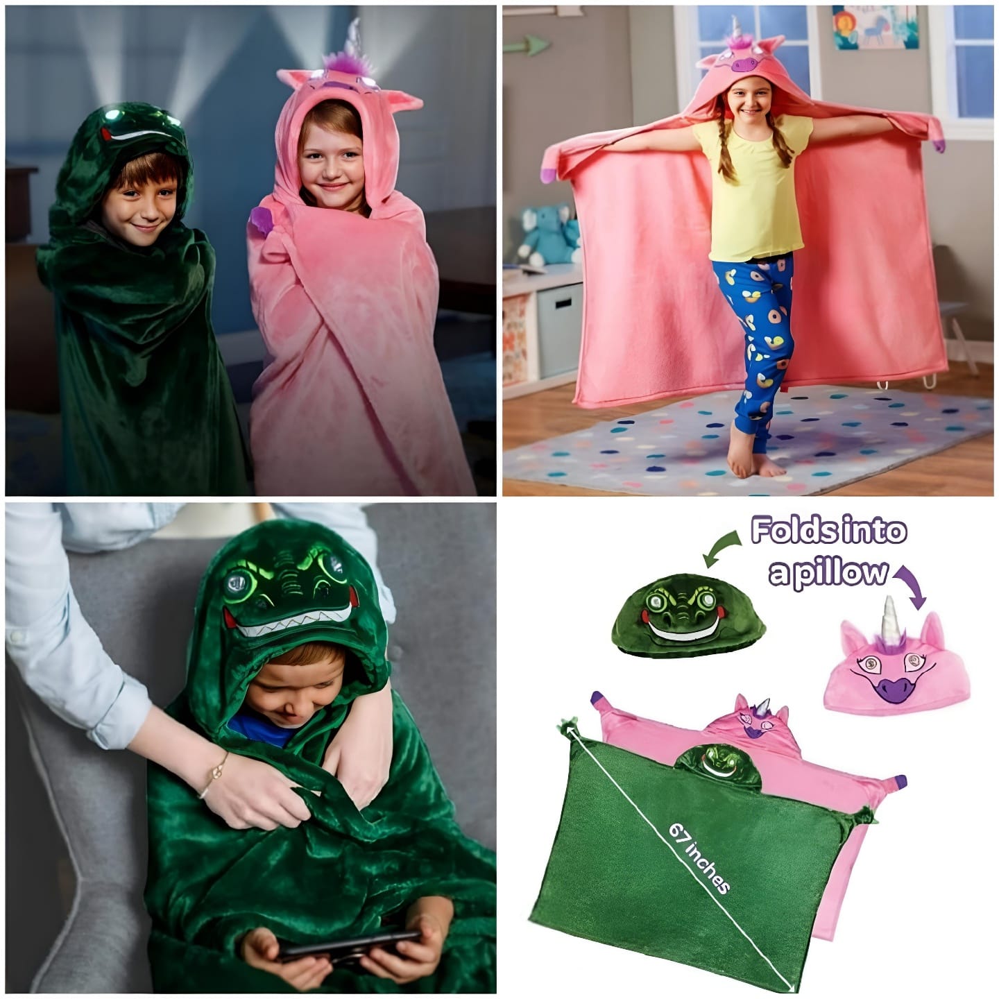 Ultra Soft Blanket with LED Lights. LED lighthat can be turned on for nighttime fun! Blanket and pillow in one. Easily folds from a large blanket into a playtime pillow. Warm and snuggly with a place for their hands. Powered by 2 x AA batteries (batteries not included). One size fits most kids – 124.5cm x 89cm (exclusive of the hood).